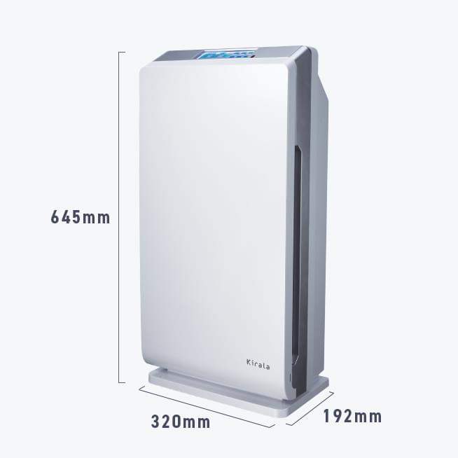 Kirala Airの空気清浄機能では、全6層の高性能フィルターを採用。集じんフィルターでは、花粉やホコリだけでなくPM2.5までも99.9%除去。ホルムアルデヒドや有害ガスなどの超微細な粒子も吸収・分解します。さらに脱臭フィルターでは、気になるニオイや有害ガスを吸収して除去。空気中の細菌も効果的に除菌します。各フィルター名:①高密度フィルター ②HEPAフィルター ③冷触媒フィルター ④活性炭フィルター ⑤ハニカム状活性炭フィルター ⑥光触媒フィルター